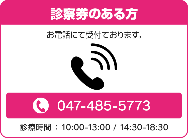 新規来院の際には、60分の診療時間が必要です。お問い合わせはお電話で承っております。TEL:047-485-5773